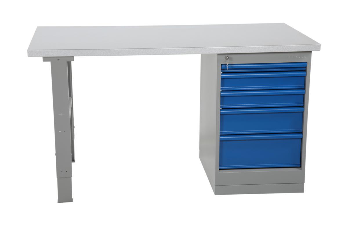 Erittäin vankka työpöytä jossa manuaalinen korkeussäätö välillä 740-1100 mm. Mukana on kestävä 42mm pöytälevy käsittelemään raskaita ja likaisia töitä. Maksimikuorma on 500 kg jaettuna tasaisesti pöydän pinnalle. Laatikot ovat kuulalaakeroidut ja ne ovat 100% ulosvedettävissä. Mukana jalkapukki ja laatikko.