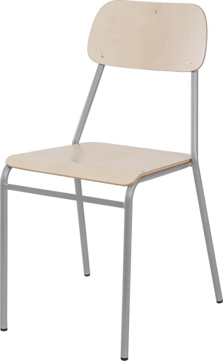 Alumaalattu teräsjalusta. Istuin ja selkänoja muotoon puristettua koivua. Pinottava.