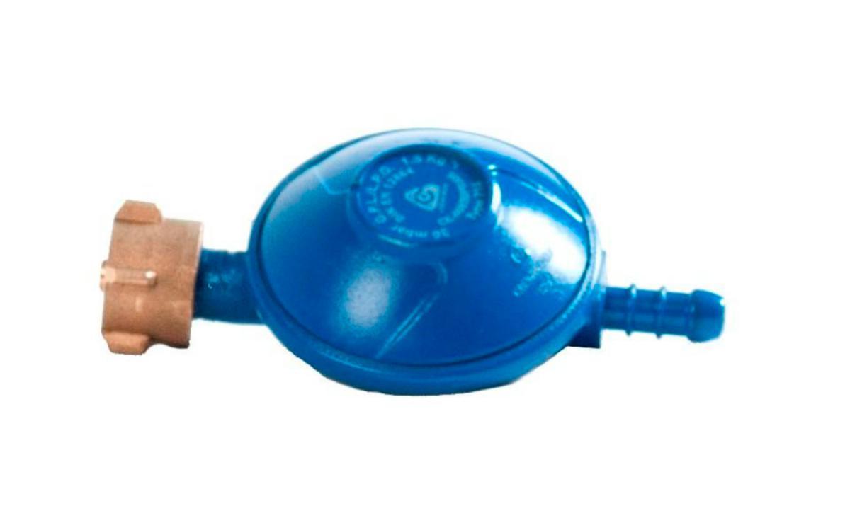 Kotitalouslaitteiden paineensäädin 30 mbar kierreventtiilipulloille. Lähtönipan halkaisija 10mm.