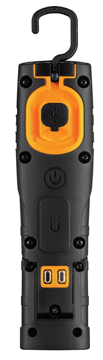 Rechargeable hand lamp with both work light and top light, as well as an emergency light function, i.e., the lamp automatically turns on if the power goes out. Lamp head adjustable 180°. Lamp body made of ABS plastic with very strong magnets; 1 on the back and 1 on the base plate. Hidden rotatable hook at the back. Charging stand has a screw mount at the back and a magnet in the base plate. Adjustable work light in two modes; max 600 lm. LED indicator blinks green during charging. Supplied with USB A to type C charging cable and charging stand. COB work light and SMD top light 120lm/10h. Burn time work light 1: 150 lm/8 h, 600 lm/2.5 h Operating temperature: -10° - +40° Rechargeable built-in battery: 3.7V 260mAh Li-ion Dimensions: 192x51x33mm Weight: 250 grams (excluding holder)