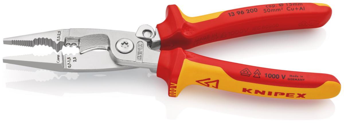 6 toimintoa yksissä pihdeissä. Monitoimipihdit sähköasennustöihin; tarttumiseen latta- ja pyörömateriaaliin, taivutukseen, purseen poistoon, kaapelin leikkaamiseen, pääteholkkien kuorintaan ja kutistamiseen. Sileät tartuntapinnat kärjessä yksittäisiin säikeisiin tarttumiseen niiden vaurioitumatta, profiloidut tartuntapinnat ja soikea kita-aukko latta- ja pyörömateriaaliin tarttumiseen. Hieman terävämpi ulkoreuna leualla jakorasioiden käsittelyyn ja purseen poistoon läpivientirei’istä. Kuorintareiät johtimille 0,75-1,5 mm² ja 2,5 mm². Päätehylsyjen 0,5 – 2,5 mm² kutistukseen. Kaapelileikkuri tarkkuusterillä (induktiokarkaistu) kupari- ja alumiinijohtoihin max 5 x 2,5 mm² / Ø 15 mm. Hyvä ulottuvuus kapean rakenteen ansiosta. Ruuvattu nivel: tarkka, hukkaliikkeetön pihdin toiminto. Erikoistyökaluteräs erikoislaatua, taottu, moniportaisesti öljykarkaistu.