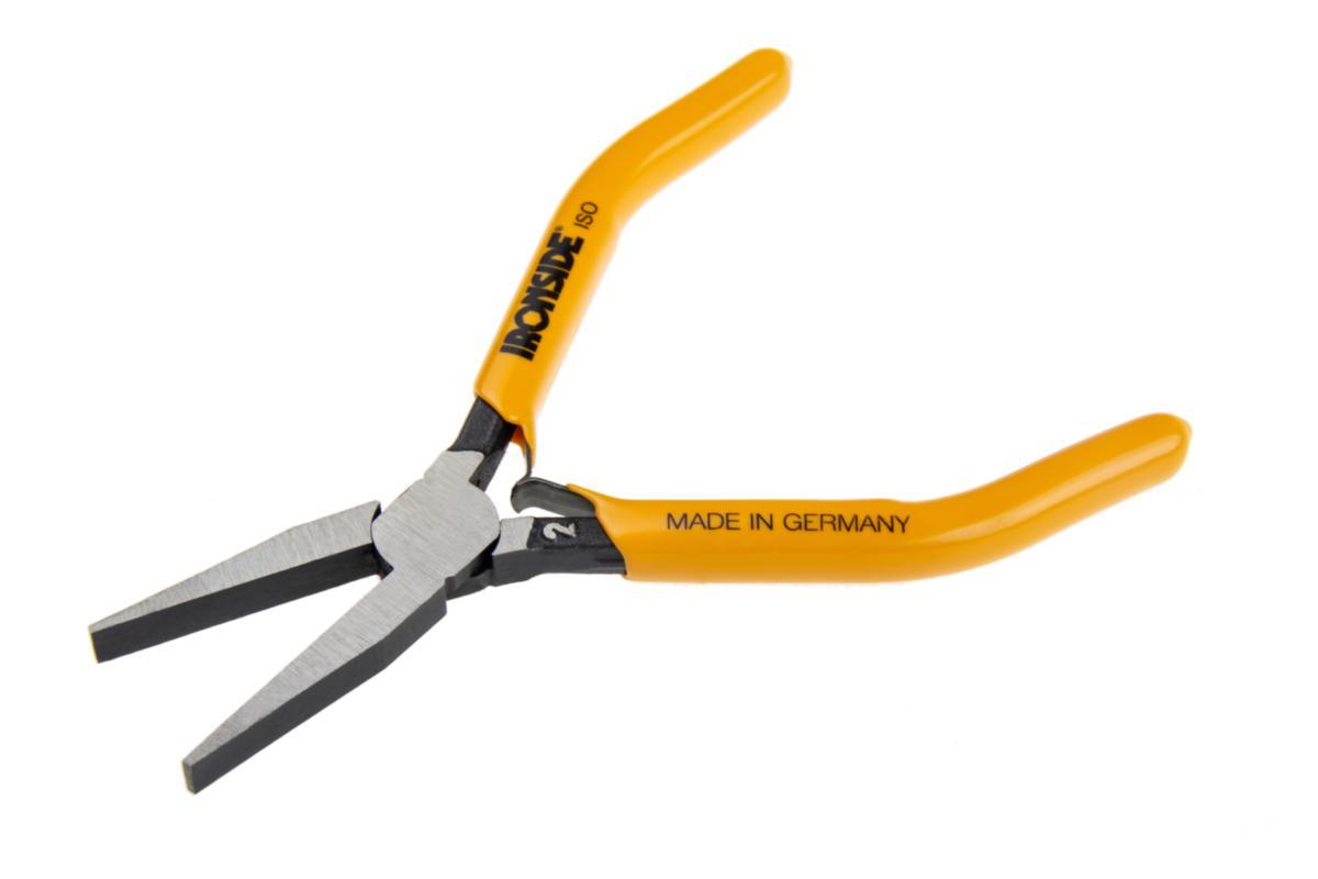 Kiilloitetut suojalakatut leuat, yksinkertainen nivel, palautusjousi. Muovitetut kahvat.