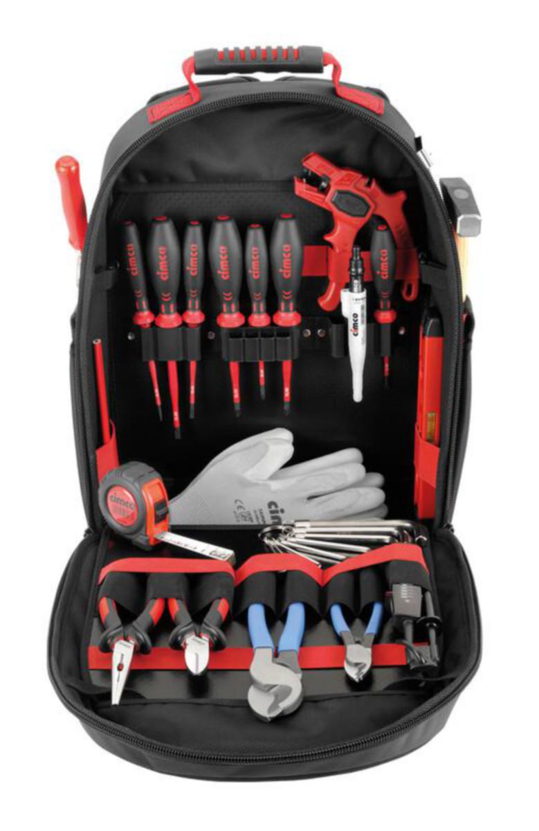 Tukeva ja säänkestävä reppu, joka on valmistettu polyesteristä, ja jossa on muovikuori. Paino työkaluineen: 4 500 g.