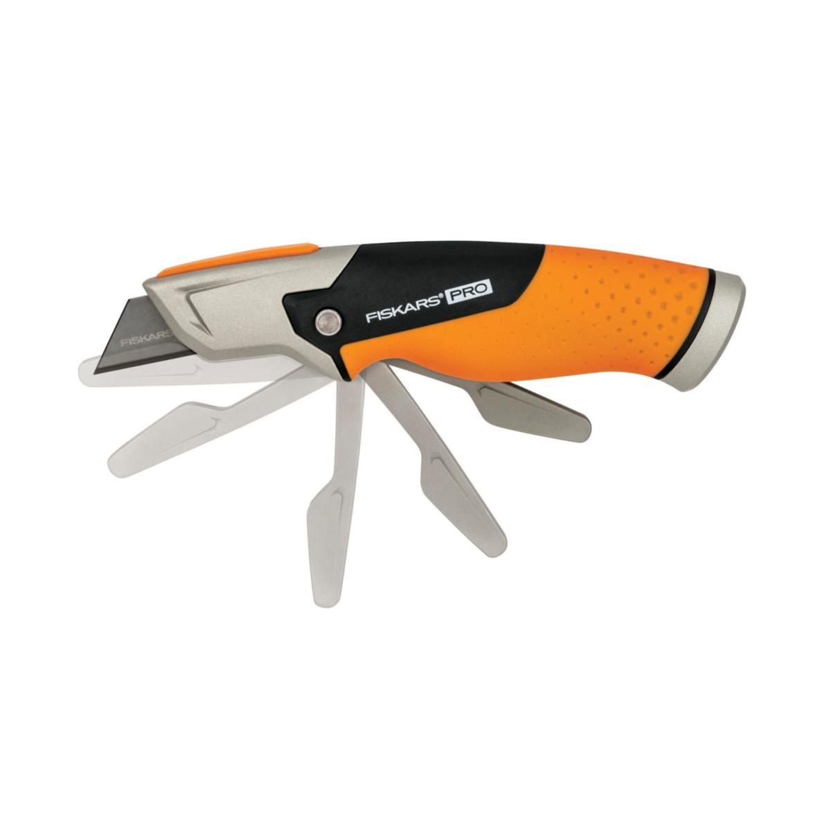 Fiskars CarbonMax™ kiinteäteräinen mattoveitsi on turvallinen ja helppokäyttöinen taittuvan teränsuojuksensa ansiosta. Veitsen terä pysyy tukevasti paikoillaan, eikä terä pääse liikkumaan käytössä. Teränsuojus asettuu paikoilleen napin painalluksella. Veitsen runko avautuu saranoiden avulla ja magneetti pitää terän paikoillaan, jotta sen vaihtaminen olisi mahdollisimman helppoa ja turvallista. Sisäänrakennettuun terien säilytystilaan mahtuu 5 vaihtoterää. Veitsi on tehty kestämään iskuja ja veitsen putoamisen. Pakkaukseen kuuluu yksi CarbonMax™ -terä, joka kestää jopa 24 kertaa pidempään kuin perinteiset terät.