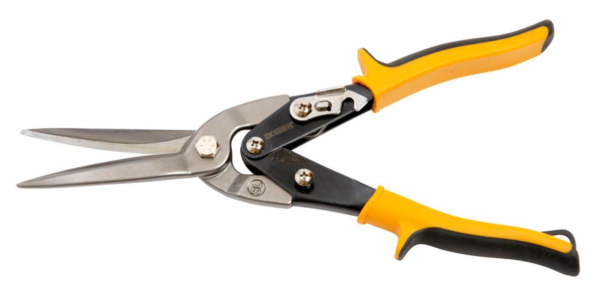 Induktiokarkaistut (HRC 60-62), kevyesti hammastetut terät molybdeeniterasta. Leikkaa teräspeltiä aina 1,0 mm ja ruostumatonta terästa ain 0,5 mm: paksuuteen saakka. 2-komponenttikahvat. Pituus 290 mm.