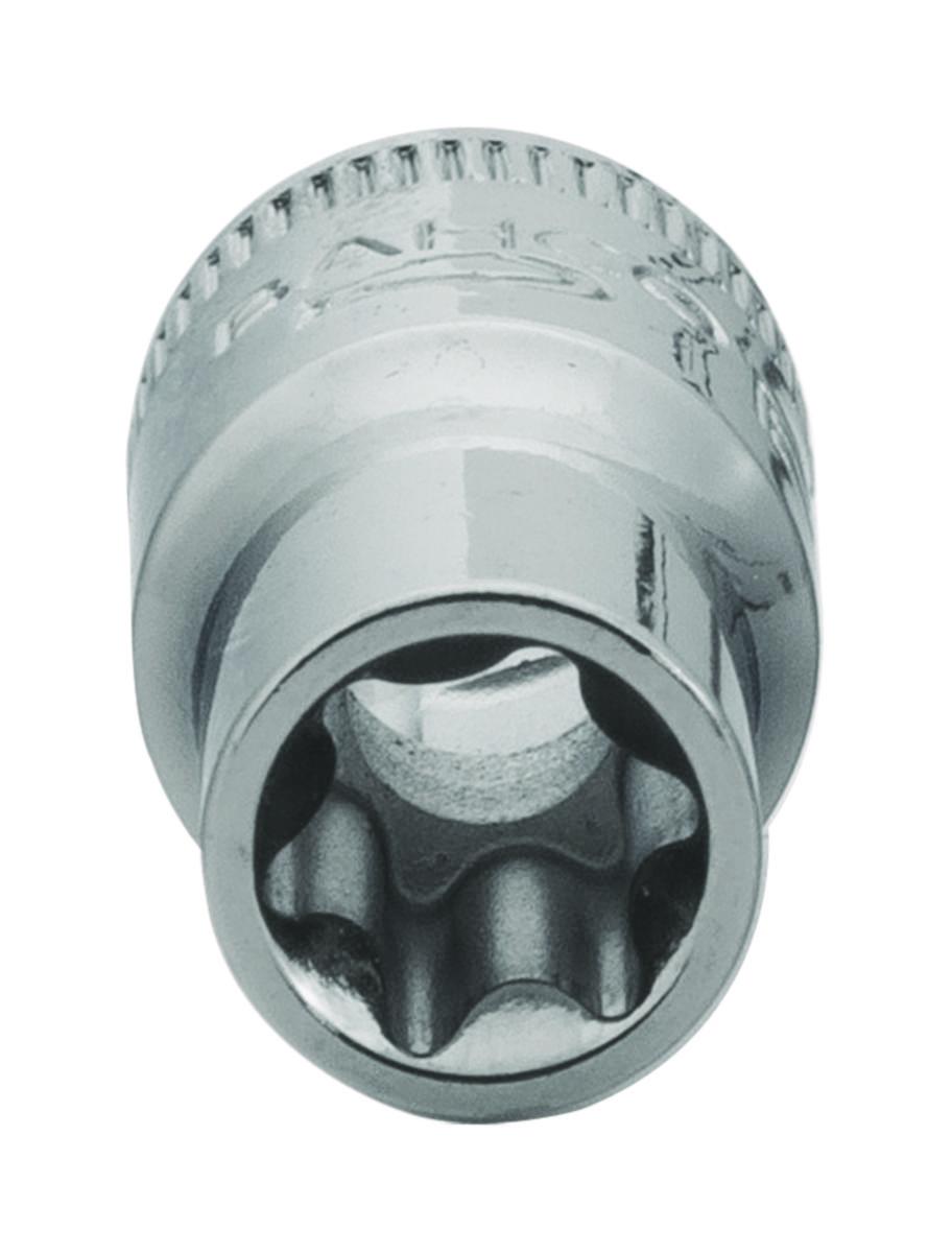 1/4" TORX® hylsy. Hylsy ulkop. Torx-ruuveille. CHROME-EXTRA-teräs. Niklattu ja kiillotettu. ISO 2725, 1174. DIN 3124, 3120. ISO 2725 / 1174. DIN 3124 / 3120.