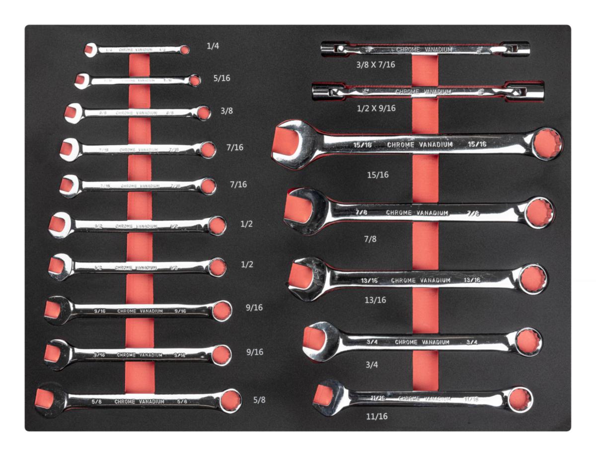 Kromivanadiiniteräksestä valmistetut työkalut on lajiteltu siististi vaahtokumisisäosiin, joissa on tarkka paikka ja merkintä kullekin työkalulle. Sisältö: Kiintolenkkiavaimet 1/4", 5/16", 3/8", 2 x 7/16", 2 x 1/2", 2 x 9/16", 5/8", 15/16", 13/16", 3/4" ja 11/16". Nivelhylsyavain, kaksipäinen 3/8" x 7/16" ja 1/2" x 9/16". Vaahtokumisisäosan koko (PxLxK): 390x570x33 mm.