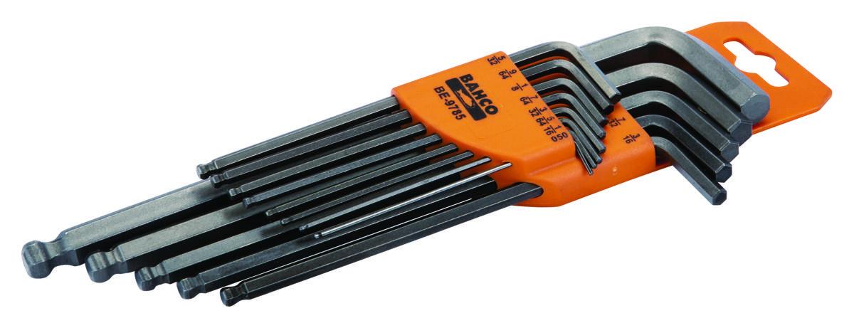 Kuusiokolokärjellä varustettu L-avainsarja, taivutettu, pitkä pallopää, 13 osaa, tuumakoot. Kuusioavaimet, pitkävartinen pallopää. Helppo asettaa ruuvin kantaan useista kulmista. Tehokkaampi, säästää aikaa.