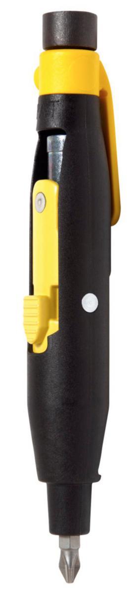 Kynämalli muovia/terästä. Vakiomitat; neliöt, kolmiot, pyörä siivillä, kärjet PH2 sekä magneettinen bits-istukka.