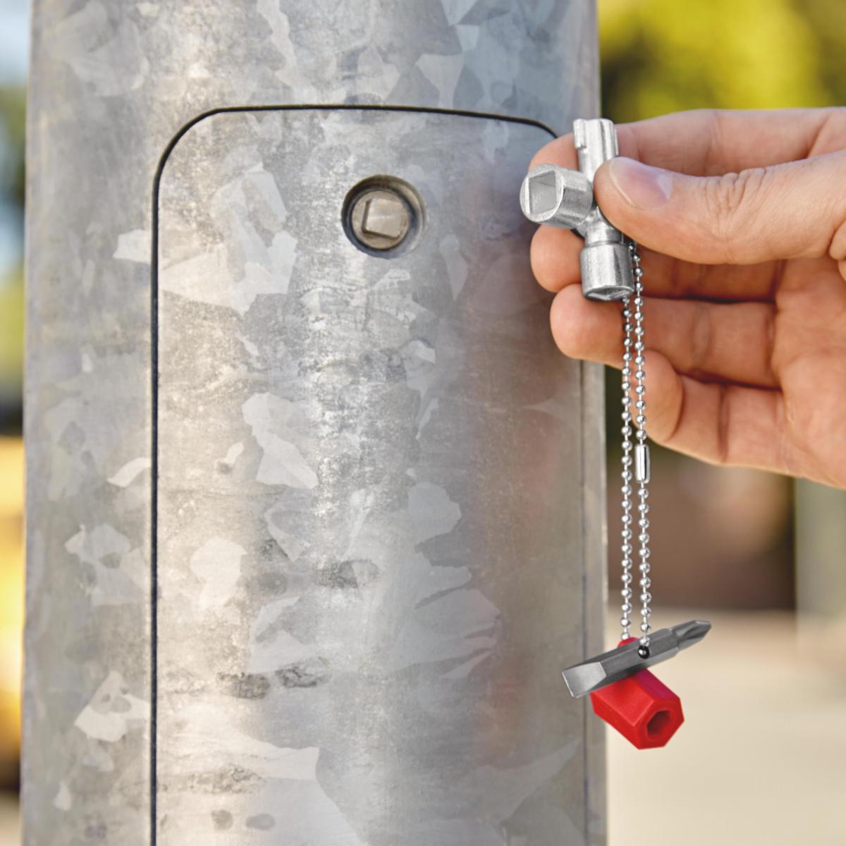 Sähkökaappeihin, kaasu-, vesi- ja sähkösyötön sulkujärjestelmiin. Teknisiin laitteisiin rakennuksissa, kuten ilmastointilaitteisiin, sulkuventtiileihin, sähkönkytkentätauluihin jne. Bittiosalla: rako 1,0 x 7 mm ja ristipää PH2