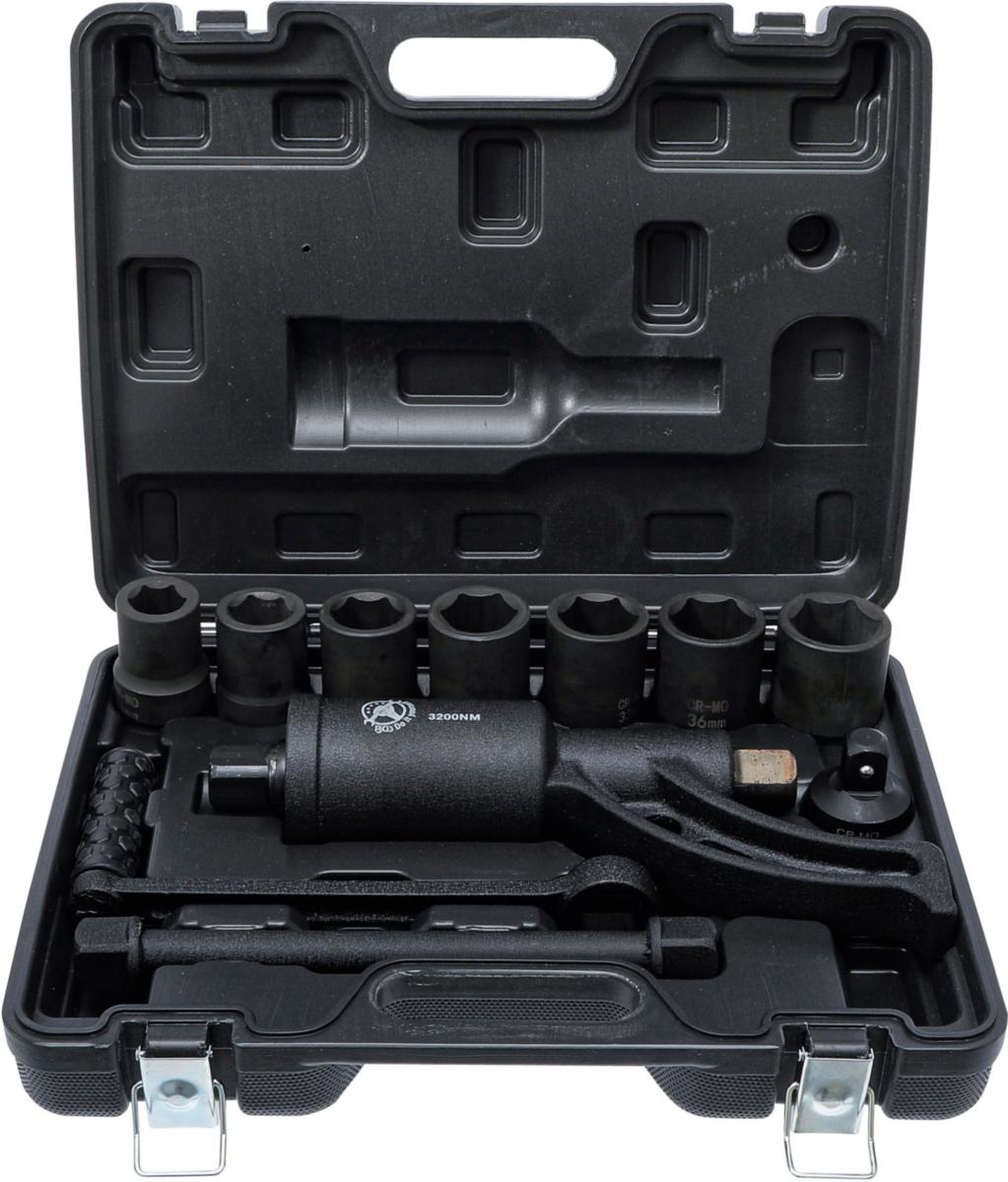 Jumiutuneiden pyöränmutterien löysäämiseen kuorma-autoissa ja pakettiautoissa. Muunnos 1:56. Sisältää 7 kromivanadiiniteräksestä valmistettua hylsyä. Hylsyt, 25 mm (1") kara, kuusikulmio 24 - 27 - 30 - 32 - 33 - 36 - 38 mm.