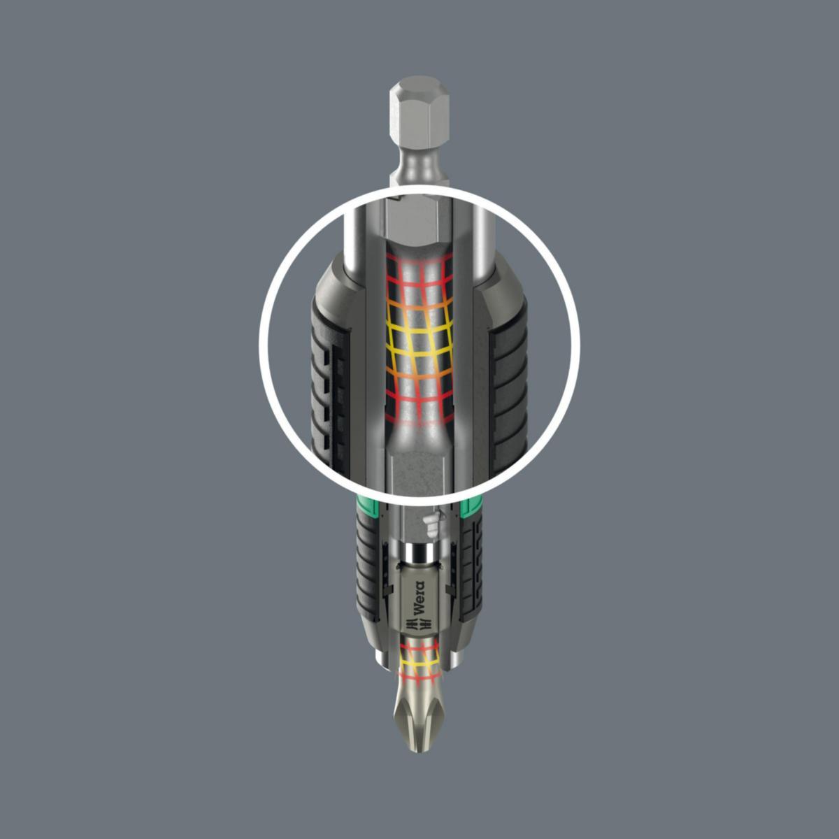 Bits-kärjet uraruuveille. Bits-kärkien päässä pieniä timanttihiukkasia. Ne takaavat varman pysyvyyden ruuvinkannassa, vähentävät tarvittavaa painetta ja poisluiskahtamisen vaaraa. Torsion-alue, johon kineettinen energia johdetaan kuormitushuipuissa. Tämä lisää merkittävästi tuotteen käyttöikää. 1/4" kuusiokanta, sopii standardin DIN ISO 1173-D 6,3 mukaisiin pitimiin.