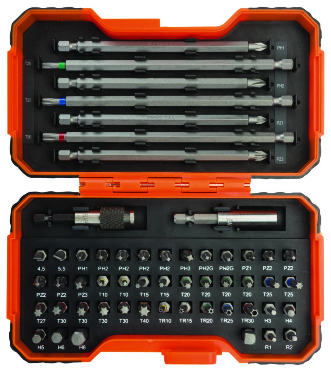 Sisältää 54 osaa: 51 ruuvikärkeä + 1 magneettinen yleiskärkipidike + 1 magneettinen kärkipidike pikairroituksella + 1 hylsysovitin 1/4"