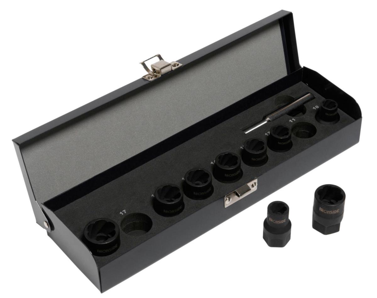 Pultin- ja ruuvinirrotinsarja, 10 osaa, rikkiruostuneiden tai pyöreäksi vääntyneiden pulttien ja muttereiden irrottamiseen. Voidaan käyttää myös useimmille lukkopulteille, joiden alkuperäinen työkalu puuttuu. Seostettua erikoistyökaluterästä. Kartiomaiset vasenkierteiset ja läpäisevät hylsyt soveltuvat käytettäväksi myös kierretankojen muttereille jne. 1/2" - 10,11,12,13,14,15,16,17,19 mm ja irrotin. Toimitetaan käytännöllisessä peltikotelossa.