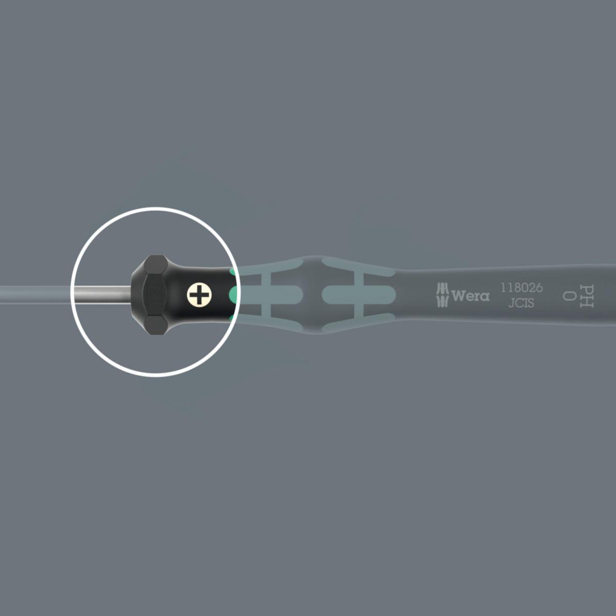Laadukas Wera Micro -ruuvitaltta hienomekaanisiin ruuviliitäntöihin. Nopea pyörittäminen on mahdollista, koska käden voi tukea pyörivään kahvan päähän ja koska pyörivän suojuksen alla on nopean pyörittämisen alue. Aikaa vievää otteen vaihtamista ei tarvita. Voima-alue ja integroidut pehmeät alueet varmistavat korkeiden irrotus- ja kiristysmomenttien siirron. Tarkkuusalue oikean kääntökulman saavuttamiseen tarkoissa säätötöissä. Weran Black Point -kärki tarjoaa erittäin suuren tarkkuuden ja optimoidun korroosiosuojan. Take it easy -värikoodausjärjestelmä, jossa värikoodit profiilien mukaan ja kokomerkintä - tarvittavan työkalun helppoon ja nopeaan löytämiseen.