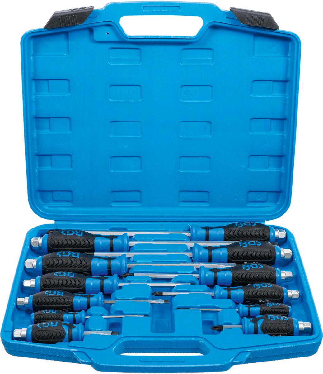 Läpimenevät terät ulkoisella kuusikulmiolla. Ergonomisesti muotoiltu "soft grip" -kahva. Sisältää seuraavat työkalut: Talttapäät: SL: 3,2 x 75 mm - 5,0 x 75 mm - 6,0 x 100 mm - 6,0 x 38 mm - 8,0 x 150 mm - 9,5 x 200 mm. Ristipäät: PH0 x 75 mm - PH1 x 75 mm - PH2 x 100 mm - PH2 x 38 mm - PH3 x 150 mm - PH4 x 200 mm.
