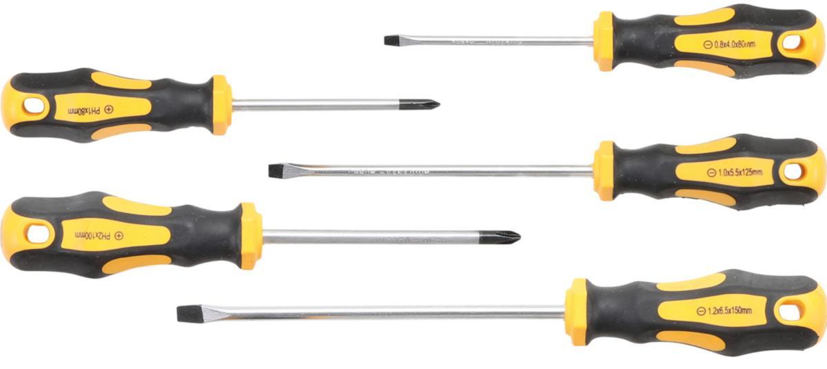 Mustat kärjet. Magneettiset kärjet. DIN 5264 mukaan. Toimitussisältö: ruuvimeisseli, ura SL 4,0 mm, 80 mm. Ruuvimeisseli, ura SL 5,5 mm, 125 mm. Ruuvimeisseli, ura SL 6,5 mm, 150 mm. Ruuvimeisseli, ristipää PH1 x 80 mm. Ruuvimeisseli, ristipää PH2, 100 mm.