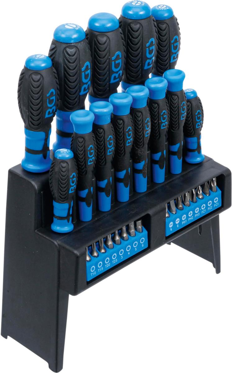 Luistamattomat 2-komponenttiset kahvat, muovisessa säilytystelineessä. Toimitussisältö: ruuvimeisselit ura SL: 3,0 x 75 mm - 5,5 x 100 mm - 6,0 x 100 mm. Ruuvimeisselit ristipää PH: PH0 x 75 mm - PH1 x 75 mm - PH2 x 100 mm. Tarkkuusruuvimeisselin ura SL: 2,5 x 50 mm - 3,0 x 50 mm. Tarkkuusruuvimeisselin ristipää PH: PH00 x 50 mm - PH0 x 50 mm. Tarkkuusruuvimeisseli T-Star (Torx): T6 x 50 mm - T8 x 50 mm. Vääntökahva bitseille, kuusikulmio 6,3 mm (1/4"), 75 mm. 30 bits-kärkeä, pituus 25 mm, ulkoinen kuusikulmiokäyttö 6,3 mm (1/4") ura SL: 4,0 - 6,0 mm. Ristipäät PH: PH1 - PH2 - PH3. Ristipäät PZ: PZ1 - PZ2 - PZ3. T-Star (Torx): T10 - T15 - T20 - T25. Kuusikulmio: 3 - 4 - 5 - 6 mm.