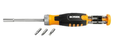 Räikkäruuvitaltta kaksoiskomponenttikahvalla. Mukana 12 kärkeä ruuvitaltan sisällä; Ura 4-5-6 mm, PH 1-2-3, Torx 15-20-25, Kuusiokolo 3-4-5.