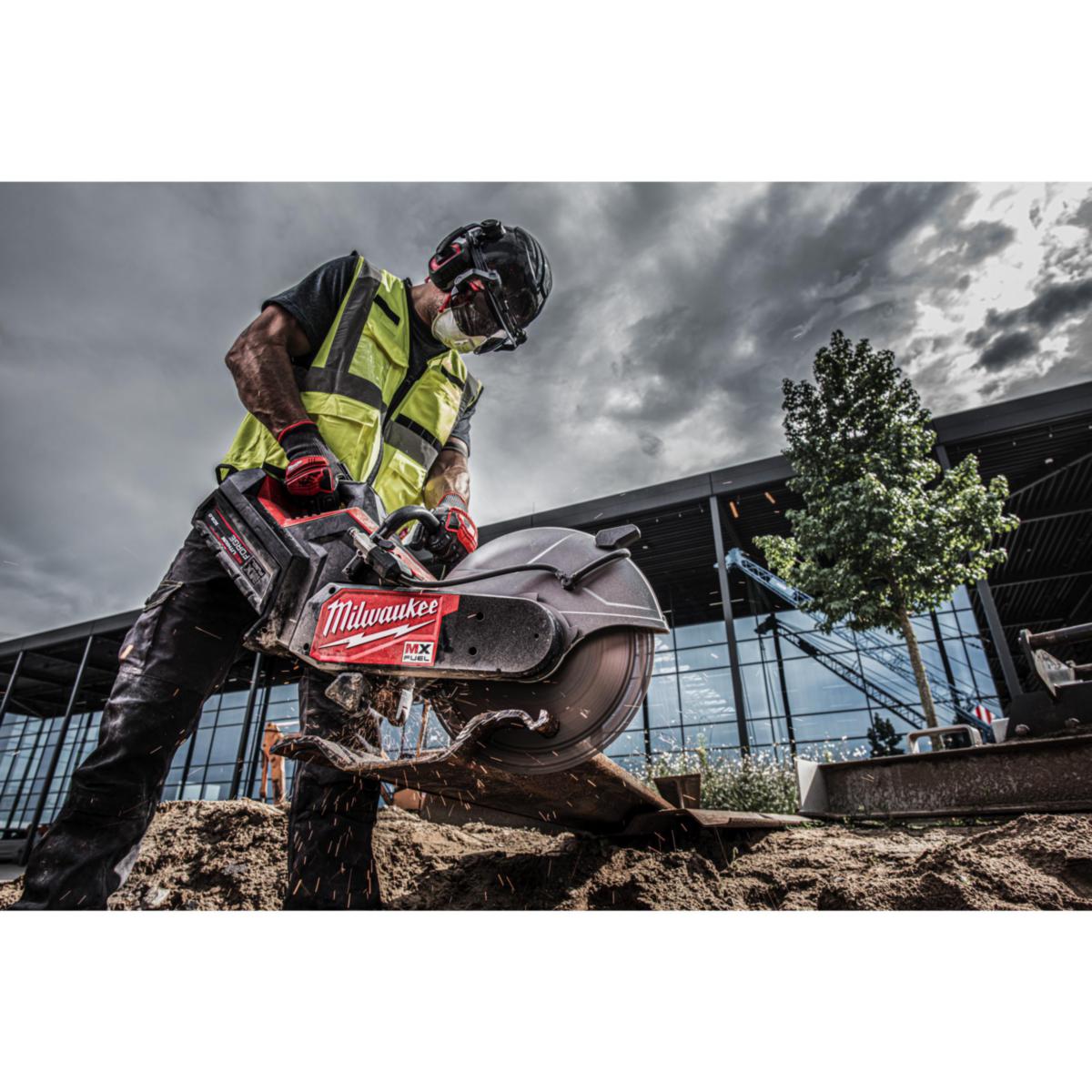 MX FUEL™ 350 mm -akkulaikkaleikkuri. Käynnistyspainike käynnistää työkalun 3 sekunnissa. Takapotkujärjestelmä suojaa käyttäjää loukkaantumiselta takapotkun sattuessa. RAPID STOP™ -laikkajarru pysäyttää laikan alle 4 sekunnissa. Akkukäyttöisyys mahdollistaa työkalun käytön sisätiloissa poistaen haitalliset polttoainepäästöt. Portaaton 5370 kierr./min nopeus. 125 mm katkaisusyvyys. Työkaluton laikkasuojan säätö ja integroitu metallinen vesilinja märkäkatkaisuun. ONE-KEY™-työkaluseuranta ja -turvallisuus. Paino akun kanssa 14,7 kg. Mukana toimitetaan HUDD 350 mm timanttilaikka (4932471985) (ilman akkua ja laturia). Toimitetaan ilman laatikkoa.