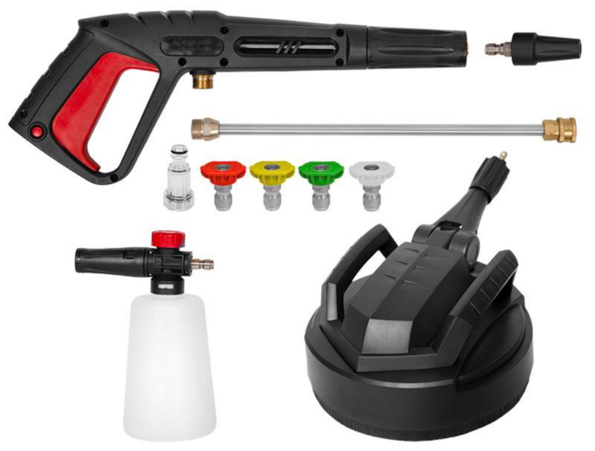 pyörivä turbosuutin, terassipesin, tulovesiletkun pikaliitin suodattimella ja pesuainevaahdotin.