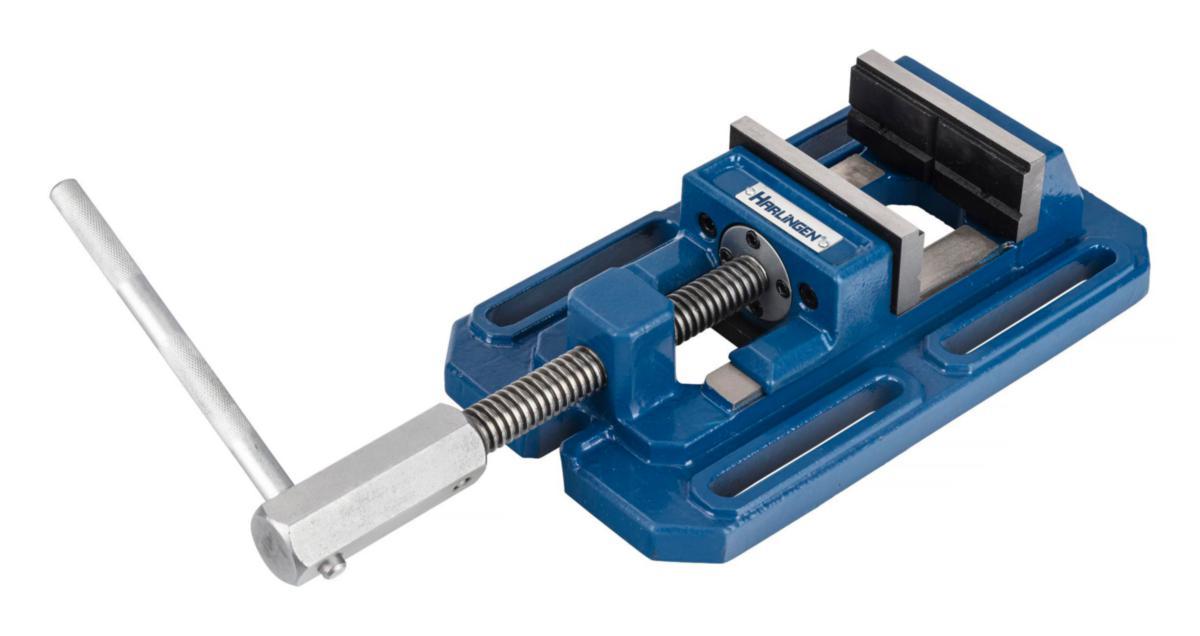 Tarkkuusruuvipuristin pylväsporille, prismaleuka 1 vaakasuora V-ura, 3 pystysuoraa V-uraa. Tarkkuushiotut ohjaimet ja pohjalevy, yhdensuuntaisuus 0,02 mm:n tarkkuudella.