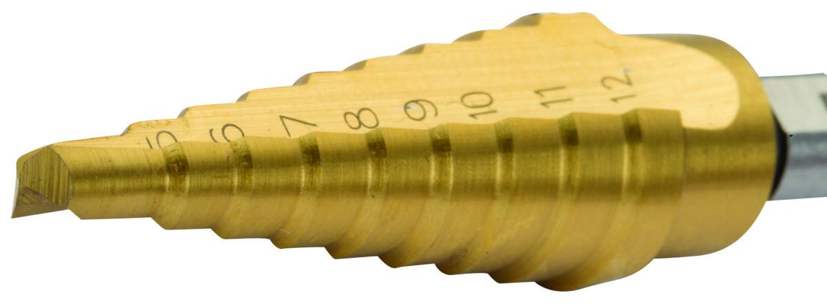 Kartiomainen ohutlevypora. Titaani-nitriitti- päällystetty pora. Pinnan kovuuden ansiosta pora kestää 4-5 kertaa kauemmin kuin perinteiset porat. Pintamateriaali vähentää myös kitkaa, pitäen terän viileänä ja sujuvan leikkuun. Reikäkoot 4-12 mm, 1 mm välein.. Kara 1/4" (6 mm). Kartioaskelporassa on todella kova titaaninitridipinnoite, joten se kestää 4–5 kertaa perinteistä askelporaa pitempään. Pinnoite vähentää myös kitkaa, joten porauksessa syntyy perinteistä vähemmän lämpöä ja terä toimii ikään kuin itsevoitelevasti. Reikäkoko 4–12 mm, 1 mm:n portaissa. Kara 1/4" (6 mm).