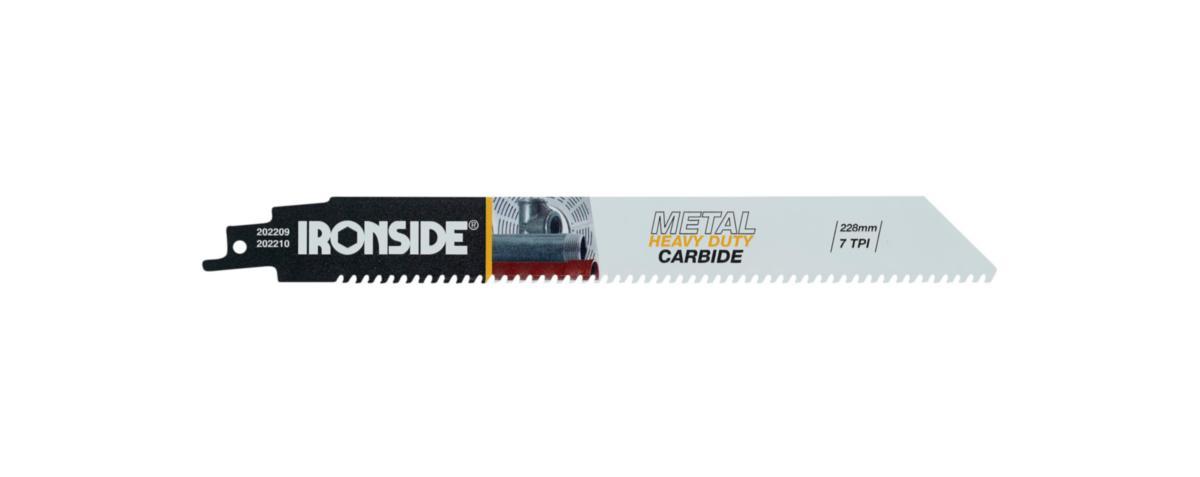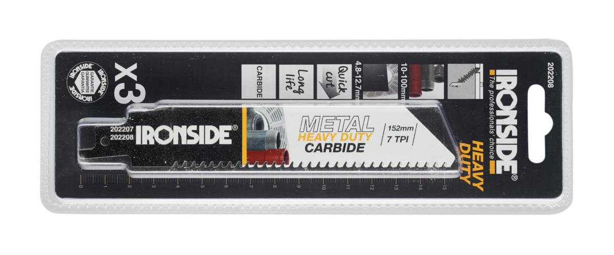 Karbidi. Erikoismetalliseoksesta valmistettu terä, joka on muotoiltu leikkaamaan pidempään kuin olemassa olevat vakiometalliterät. 7-hampainen rakenne varmistaa sahan nopean käynnistymisen ja tarkat leikkaukset. Isot syvennykset helpottavat lastunpoistoa. Valuraudan/putkien ja muiden järeiden metallien nopeaan leikkaukseen. Sahanterän vahva 1,25 mm sileä osa varmistaa tarkat leikkaukset. 25 mm teräkorkeus parantaa vakautta ja minimoi tärinän. Ihanteellinen valuraudan ja viemäriputkien leikkaukseen.