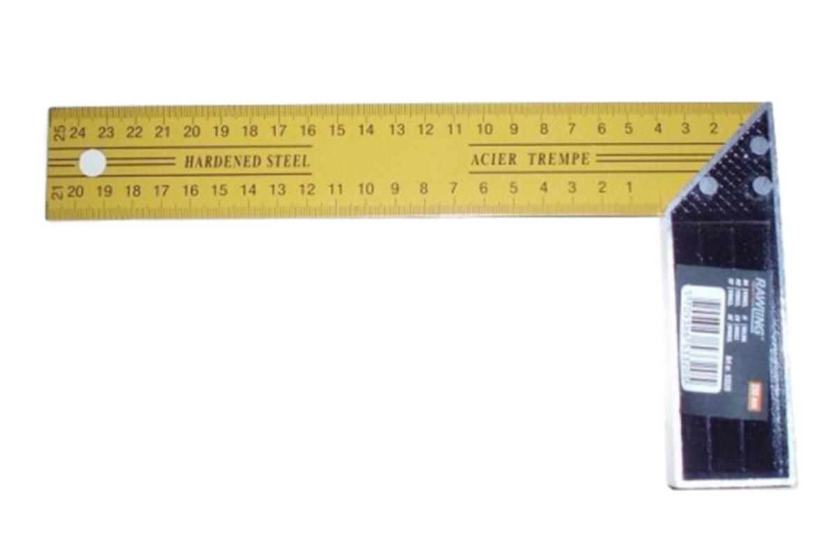 Keltalakattu puusepän kulmamitta. Mitta ruostumatonta terästä etsatulla mitta-asteikoilla. Millimetriasteikko molemmin puolin, sisä- ja ulkokulmassa.