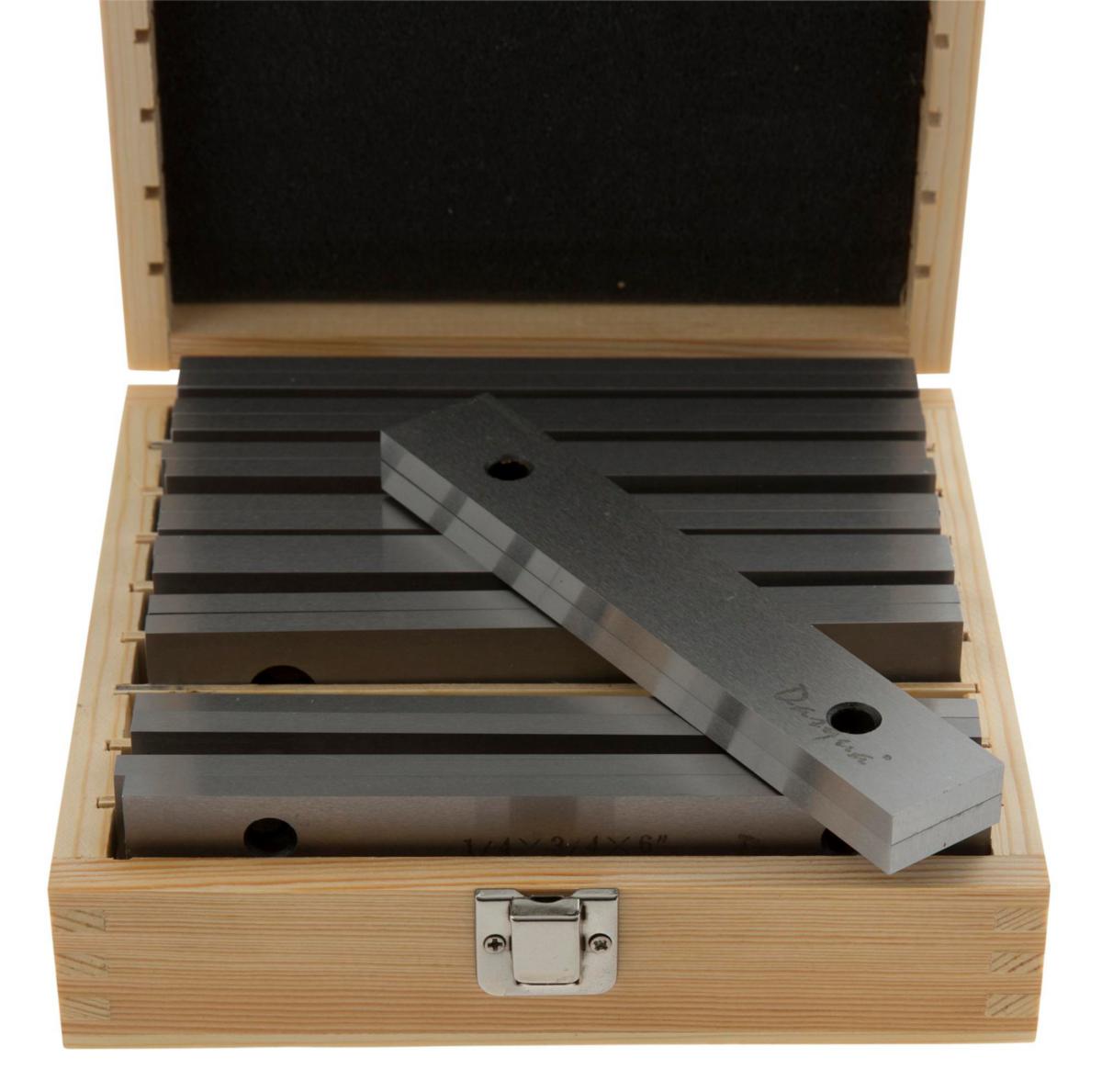 Premium-sarja, jossa 9 paria karkaistuja ja hiottuja suuntaispaloja. Korkeus: 3/4",7/8",1",1-1/8",1-1/4",1-3/8",1-1/2",1-5/8" ja 1-3/4". Suuntaispalat tuuma, pituus x paksuus: 6"x1/4" Yhdensuuntaisuus: ± 0,0005" Kovuus: 50 HRC. Toimitetaan tukevassa puukotelossa.