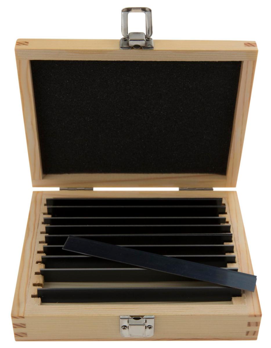 Premium-sarja, jossa 10 paria erikoisohuita karkaistuja ja hiottuja suuntaispaloja. Korkeus: 12,14,16,18,20,22,24,26,28 ja 30 mm. Suuntaispalat, mm, Erikoisohuet, vain 0,8 mm. Pituus x paksuus: 150x0,8 mm. Yhdensuuntaisuus: ± 0,001 mm. Kovuus: 50 HRC. Toimitetaan tukevassa puukotelossa.