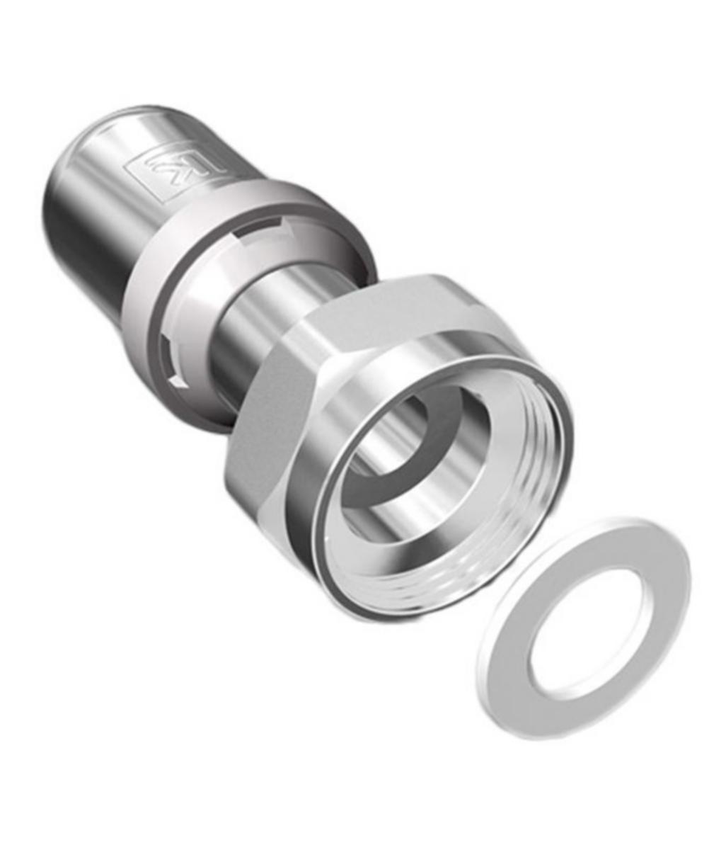 Puristusliitin LK Komposiitti- ja LK PE-X Universal-putkien liittämiseen. Liittimen toisessa päässä yhdistäjämutteri tasotiivisteellä.
