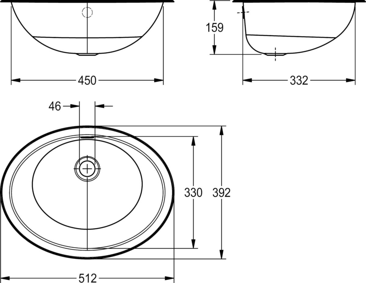 Ovaali tasoon upotettava allas, voidaan asentaa ylä- tai alapuolelta. Ruostumatonta terästä, materiaalin vahvuus 1 mm, altaan halkaisija 450 x 330 mm. Ylivuotopohjaventtiili, vesilukko sekä ruostumattomasta teräksestä valmistetut ulokkeet alapuolelta tapahtuvaa asennusta varten. Kiiltopinta. Mitat 512 x 159 x 392 mm (L x K x S)