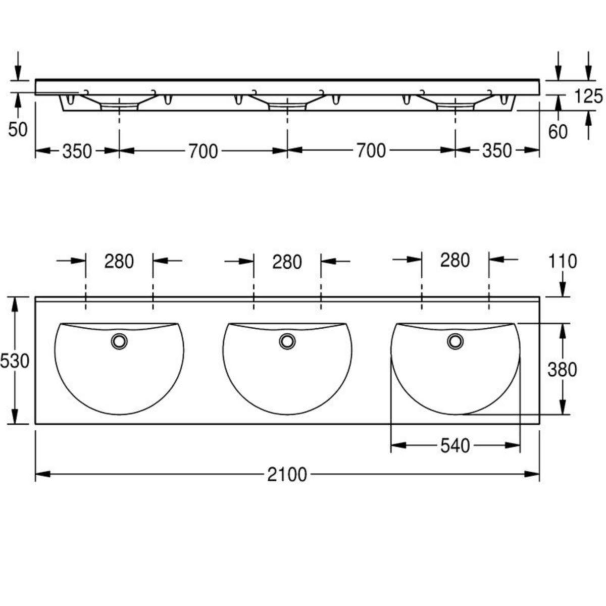RONDA -pesuallas kolmella altaalla, sileä huokokseton pinta(lämmönkesto + 80 °C). Kolme pyöreää allasta, tasainen takaosa, ei ylijuoksua. Integroitu takapaneeli, jossa reiät kiinnitystä varten. Takanosto, tasainen reuna kolmella sivulla. Sisältää kiinnitystarvikkeet (kannatuspultit ja tartuntaosat). Väri Alpine White. Ilman hanareikiä. Pesualtaan ulkomitat 2100 x 60 x 530 (L x K x S) Altaiden koko 540 x 90 x 380 (L x K x S)