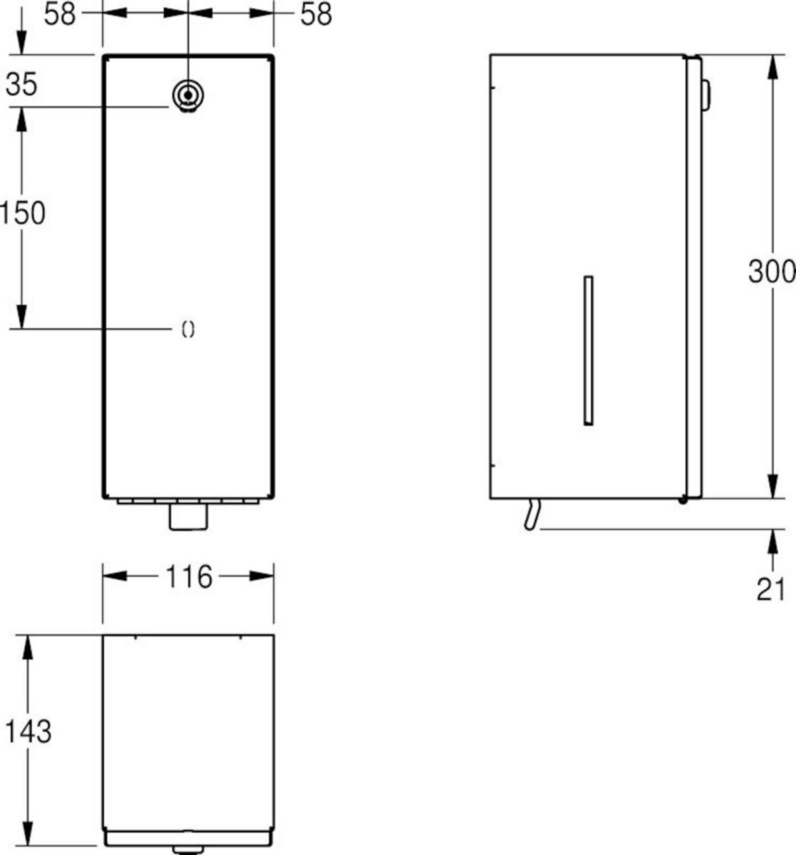 Saippua-annostelija pinta-asennukseen, ruostumatonta terästä, satiinipinta, materiaalin vahvuus 0.8 mm, etukansi taivutetuin reunoin, sylinterilukko KWC vakioavaimella, sopiva nestesaippuoille ja liuoksille, 0.8 litran saippuasäiliö, painovipu, mukana teräsruuvit ja tartuntaosat. Mitat 116 x 321 x 143 mm (L x K x S)
