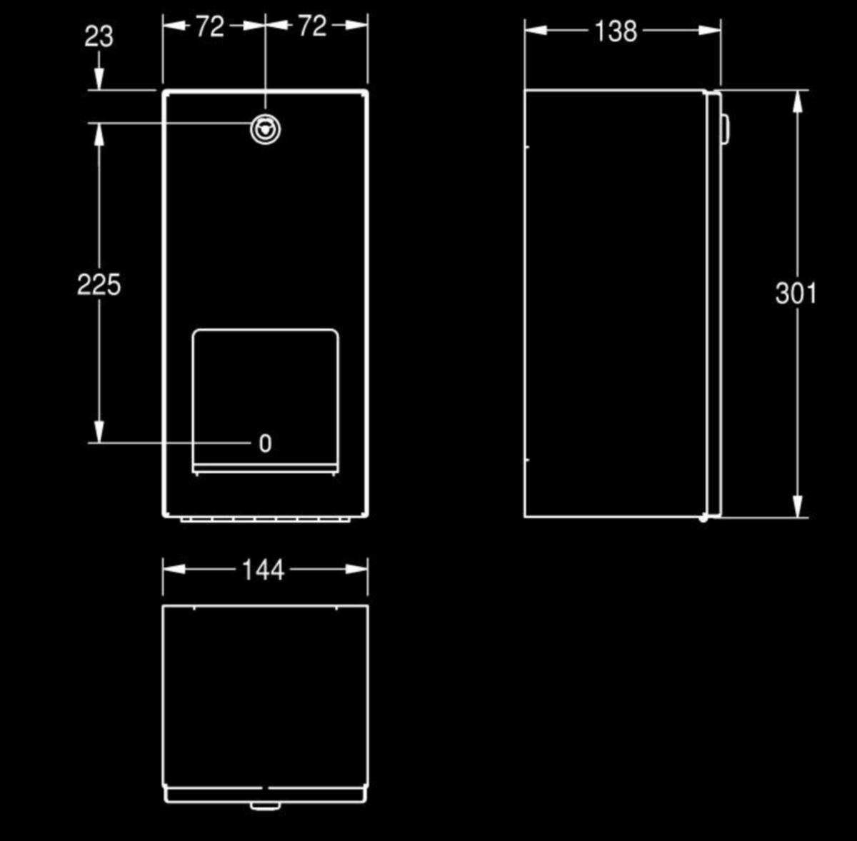 WC -paperiteline kahdelle rullalle akselirakenteella pinta-asennukseen, ruostumatonta terästä, satiinipinta, materiaalin vahvuus 0.8 mm. Etukansi taivutetuin reunoin, sylinterilukko KWC vakioavaimella, 2 rullalle max. halkaisija 120 mm, seuraava rulla vapautuu kun ensimmäinen on käytetty, sisältää akselit, vararulla ei näkyvissä, mukana teräsruuvit ja tartuntaosat. Mitat 144 x 301 x 138 mm (L x K x S)