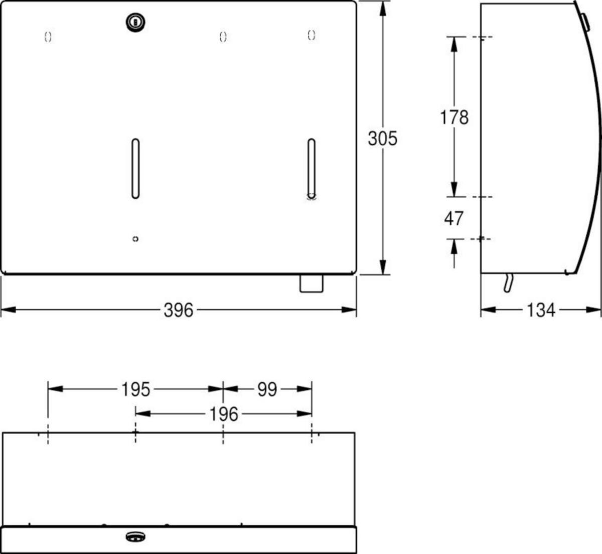 Paperipyyhe- ja saippua-annostelija -yhdistelmä pinta-asennukseen, ruostumatonta terästä, satiinipinta, InoxPlus pintakäsittelyllä sormenjälkien vähentämiseksi ja siivottavuuden helpottamiseksi. Materiaalin vahvuus 1.5 mm, kaareva etukansi, sylinterilukko KWC vakioavaimella, tarkistusikkuna edessä. Paperipyyheannostelijan täyttökapasiteetti 300 - 400 kpl riippuen paperin taitoksesta, sopiva nestesaippuoille ja liuoksille, 0.8 litran saippuasäiliö, painovipu, mukana teräsruuvit ja tartuntaosat. Mitat 396 x 305 x 134 mm (L x K x S)