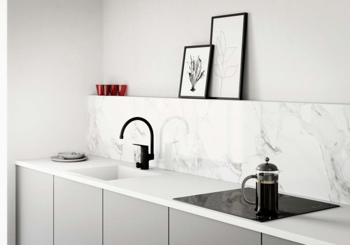 Keittiöhana, jossa pesukoneventtiili ja korkea, kääntyvä juoksuputki 120° (voidaan rajoittaa 0° tai 60°). Pesukoneventtiilissä keraaminen käyttöventtiili (90° auki-kiinni). Hanan vivussa on veden virtaamaa rajoittava ekonappi. Joustavat kytkentäputket. Huom. Juoksuputken voi asentaa joko taakse, sivulle oikealle tai vasemmalle.