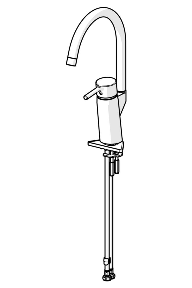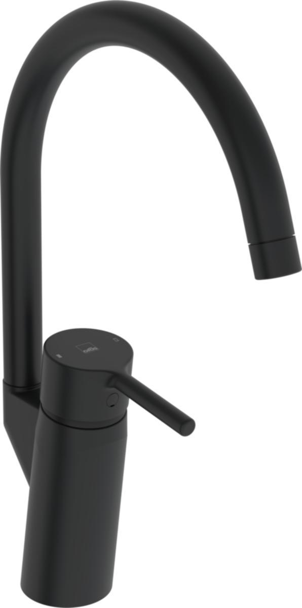 Keittiöhana jossa korkea, kääntyvä juoksuputki 120° (mahdollista rajoittaa 0°tai 60°). Puikkomainen vipu ja joustavat kytkentäputket. Mattamusta.