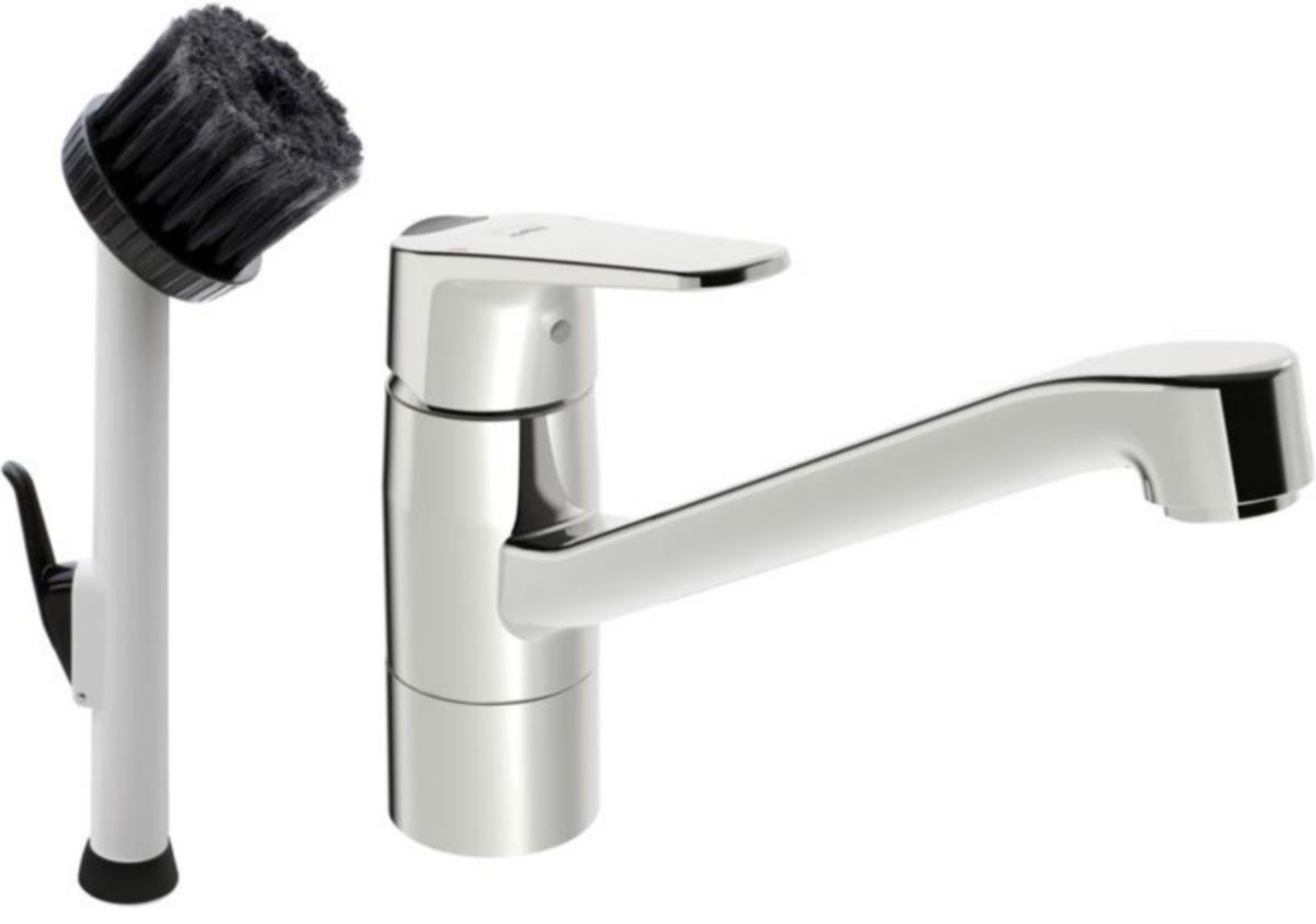 Aputilahana jossa kuraharja ja kääntyvä juoksuputki 120° (voidaan rajoittaa 40°- 80°). Hanan vivussa on veden virtaamaa rajoittava ekonappi.