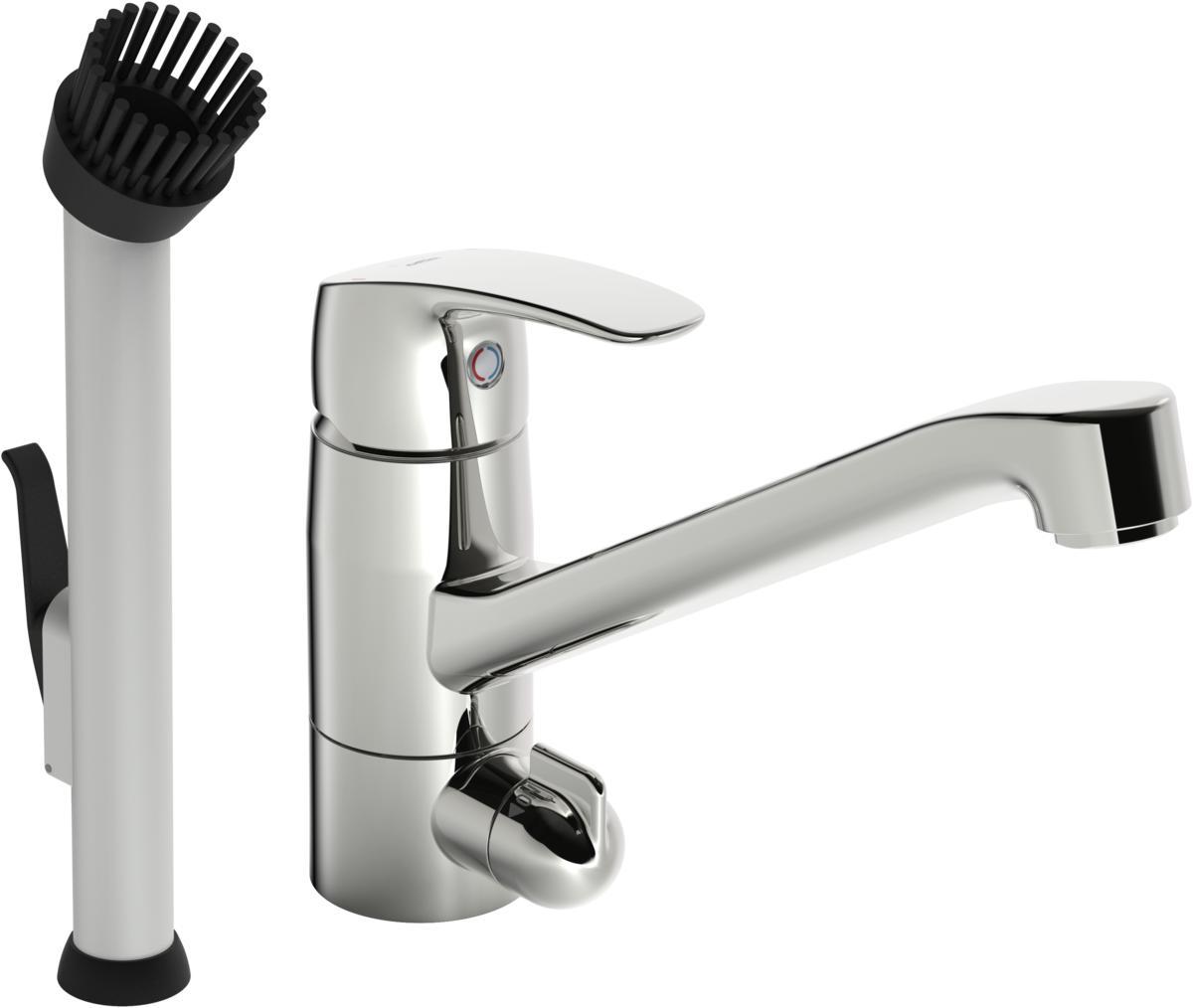 Keittiöhana, jossa pesukoneventtiili, pikapesin ja kääntyvä juoksuputki 120° (mahdollista rajoittaa 40°-80°). Pesukoneventtiilissä keraaminen käyttöventtiili (90° auki - kiinni). Joustavat kytkentäputket.