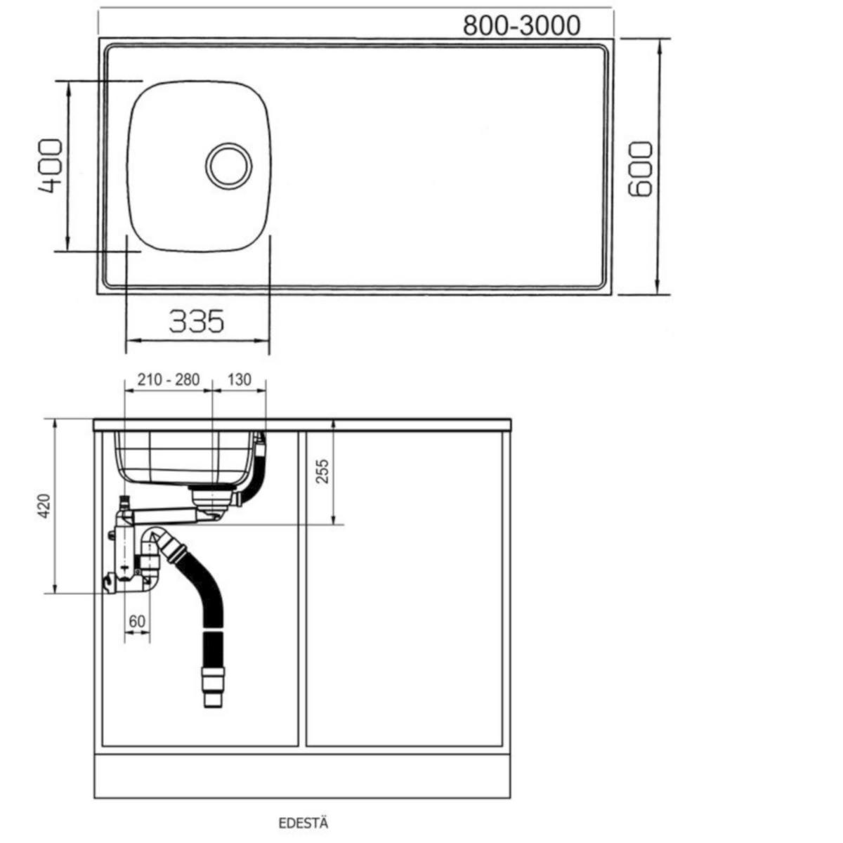 Tuula pesupöytä kiiltävällä pinnalla. Pituus 2700 mm, syvyys 600 mm Alakaappi vähintään 400 mm (400 mm:n kaappiin ylivuoto tehdään altaan taakse – asiakkaan ilmoitettava!) Altaan koko 335 x 400 x 150 mm. Soveltuu vasen- ja oikeakätiseksi. Kokonaismitta 2700x600x150 (L x S x K)