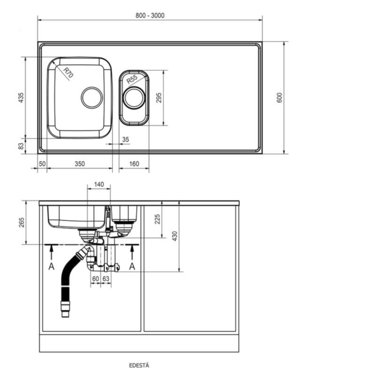 Smart pesupöytä MP altailla, pellava pinnalla. Pituus 800, syvyys 600 mm. Alakaappi vähintään 600 mm. Mikäli allas on päädyssä, niin alakaappi vähintään 650 mm. Altaiden mitat 350 x 435 x 175 mm, 160 x 295 x 120 mm. Altaan sisäkulma R =70 mm ja 55 mm Koknaismitta 800 x 600 x 175 (L x S x K) Huomioitavaa: S- mitta altaan reunasta tason reunaan mitataan aina pikku altaan puolelta.