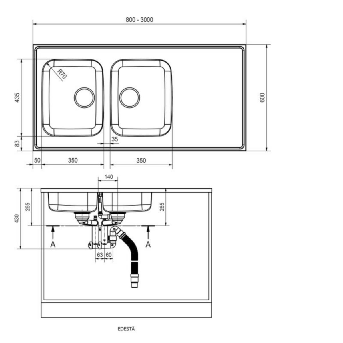 Smart pesupöytä MM altailla, kiilto pinnalla. Pituus 2200, syvyys 600 mm. Alakaappi vähintään 800 mm.Altaan mitat 350 x 435 x 175 mm x 2. Altaan sisäkulma R =70 mm. Kokonais mitat 2200 x 600 x 175 mm (L x S x K) Huomioitavaa: Tason pituus minimissään 850 mm.