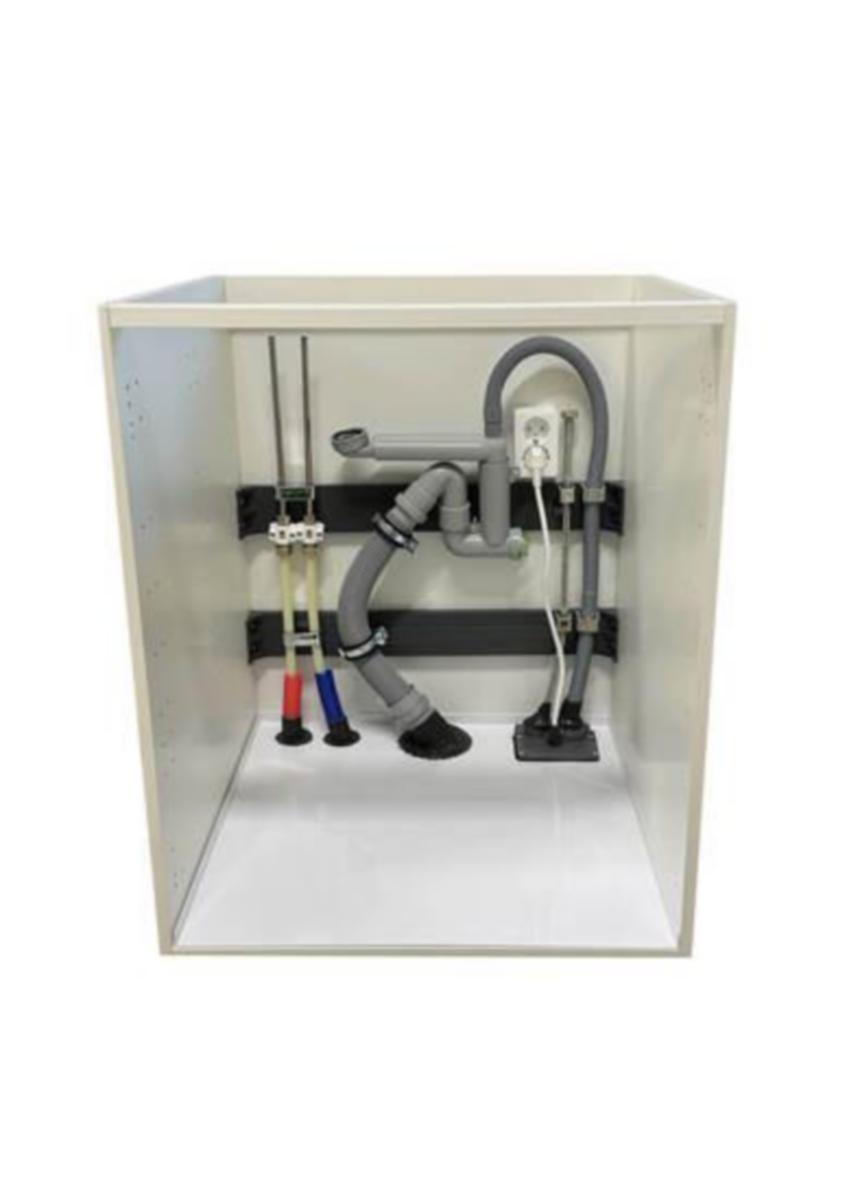 Allaskaappiin asennettavien putkien kannakointilevy. Putket kiinnitetään kannakekein kannakointilevyyn, kannakeita ei tarvitse kiinnittää pinkopahvin takana olevaan seinään eikä kylpyhuoneessa kaakeliseinään. Kannakointilevyssä on leveyden säätö, jonka ansiosta se sopii 550-800mm kaappeihin ja lyhentämällä jopa 300mm kaappeihin. Asennus on optimoitu 600mm kaappeihin.