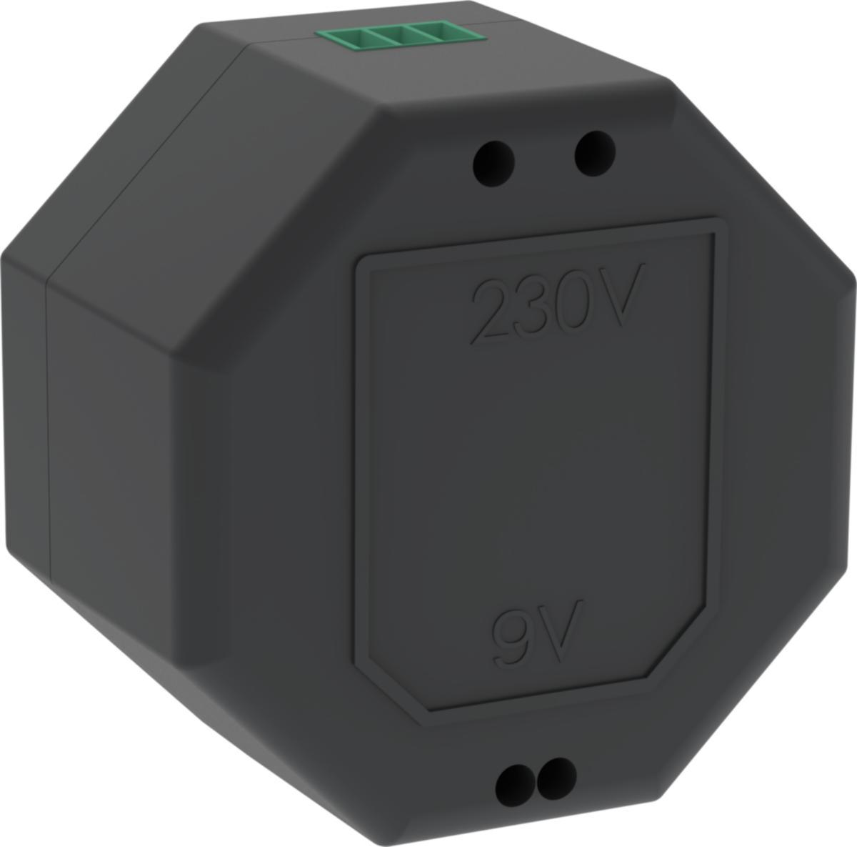Voidaan käyttää kaikissa 9 V tuotteissa. Virtalähteeseen voidaan kytkeä 5 hanaa (tarkista tuotteiden määrä asennusoppaasta, joissain tapauksissa se voi olla rajoitetumpi). Virtalähteen ja hanan välisen kaapelin kokonaispituus saa olla enintään 50 metriä. Muuntaja asennetaan 70mm:n laitekoteloon, joka on varustettu kannella. Suojausluokka IP22.