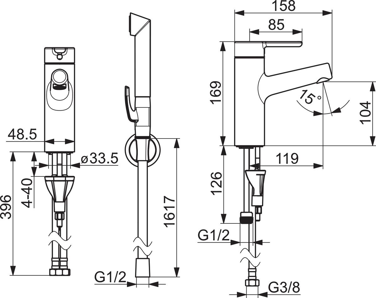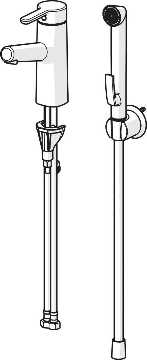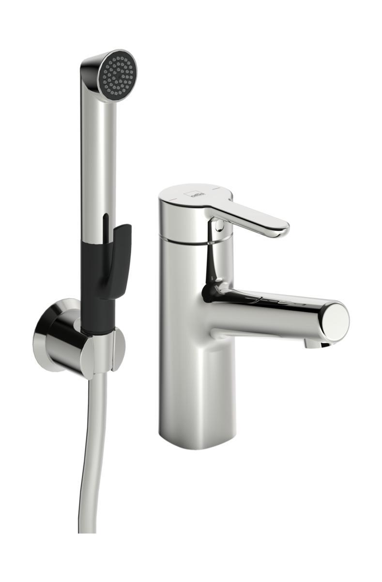 Pesuallashana, jossa kiinteä juoksuputki, Bidetta-käsisuihku ja poresuutin. Suihkuletkun pituus 1,6 m. Seinäkiinnike. Joustavat kytkentäputket.