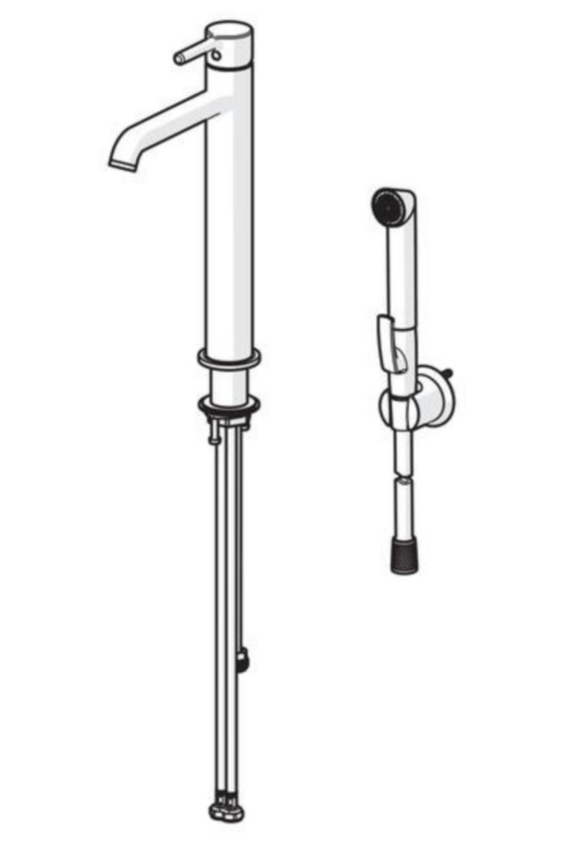 Korkea pesuallashana jossa Bidetta-käsisuihku, puikkomainen vipu ja joustavat kytkentäputket. Virtaama 6 l / min.