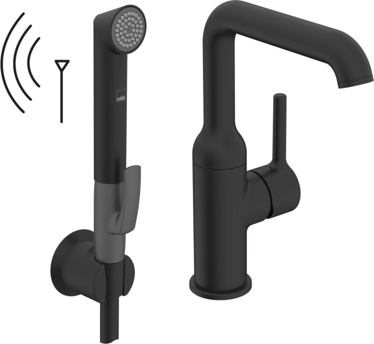 Pesuallashana jossa korkea, kääntyvä juoksuputki, etäkäytettävä Smart Bidetta -käsisuihku, puikkomainen sivuvipu ja joustavat kytkentäputket. Virtaama 6 l / min. Paristokäyttöinen 3 V. Mattamusta.