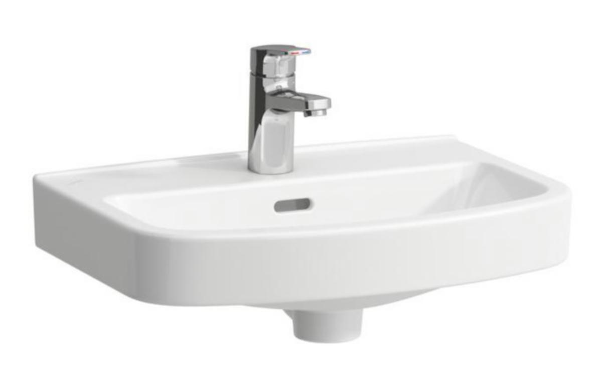 Valkoinen pesuallas. Yksi hanareikä keskellä, kokonaan lasitettu ylivuoto. Valkoinen saniteettiposliini EN 31.